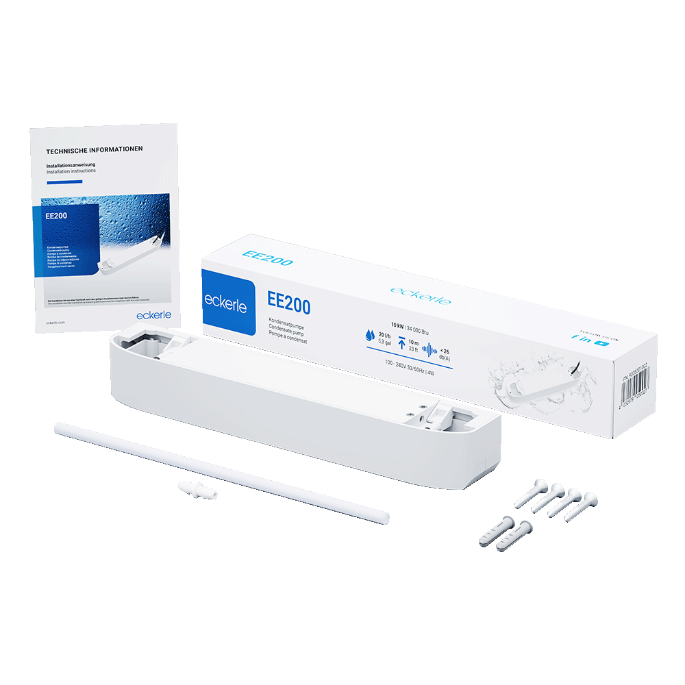 Die EE200 Membranpumpe arbeitet geräuscharm und verfügt über ein 1,5 m Netzkabel. Ein integriertes Rückschlagventil verhindert den Rückfluss von Kondensat. Mit ihrer kompakten Bauweise und attraktiven Wandverkleidung ist die Pumpe einfach zu installieren und fügt sich nahtlos in jede Umgebung ein.